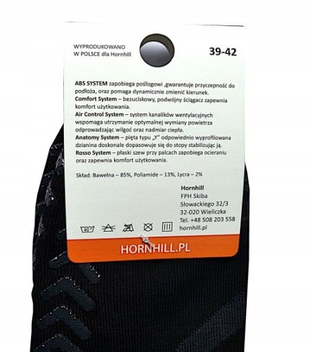 - ABS System - silikonowa (antypoślizgowa) powierzchnia znajdująca się na spodzie skarpet. Dzięki temu skarpety utrzymują się na śliskich nawierzchniach, a także nie przemieszczają w obuwiu.