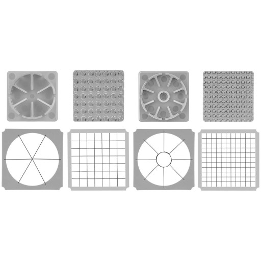 Wybierz spośród 5 różnych wkładów tnących ze stali nierdzewnej: 3 są kwadratowe, a 2 okrągłe. Kwadratowe wkłady mają wymiary cięcia 12 x 12 mm, 10 x 10 mm i 8 x 8 mm. Wykorzystasz je do krojenia warzyw na słupki, kostki czy frytki.