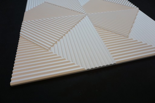 Panele mają wymiary 50 cm x 50 cm i grubości około 2,3 cm, w kilka godzin można pokryć kilkanaście metrów kwadratowych ściany, bez konieczności nawet brudzenia się (klej z tuby)! Panele można dowolnie docinać nożykiem z piłką.