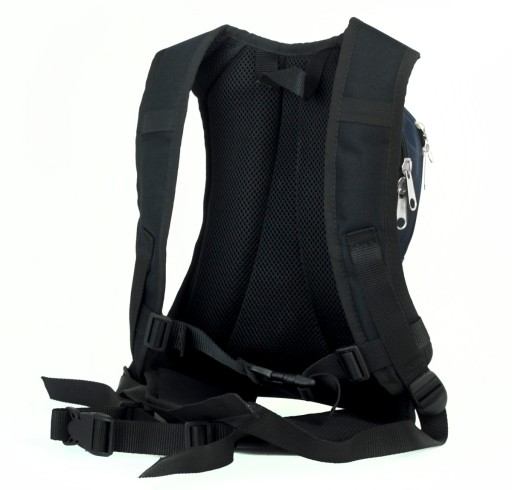 Plecak został wyposażony w regulowany pas piersiowy oraz biodrowy spinane na zatrzaski, profilowane szelki oraz delikatnie usztywnione plecy.