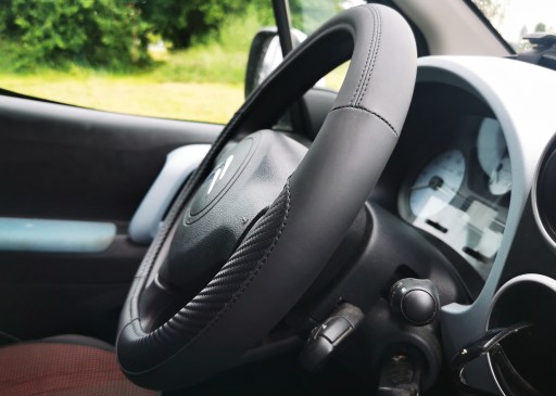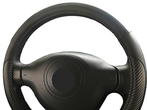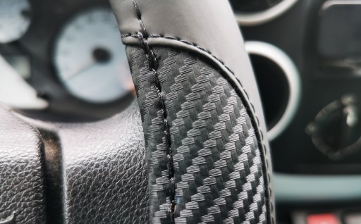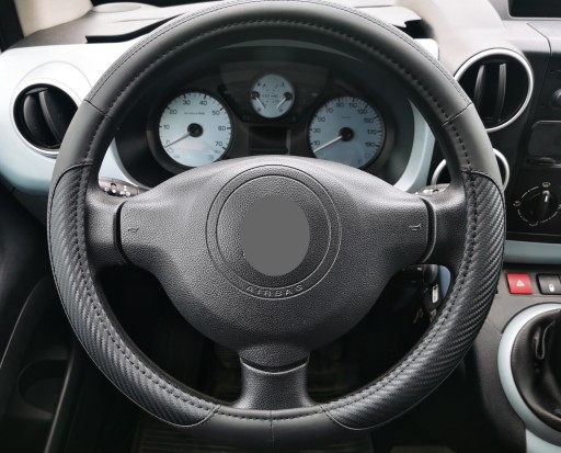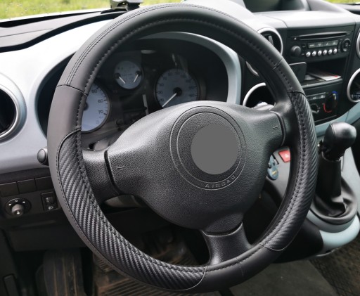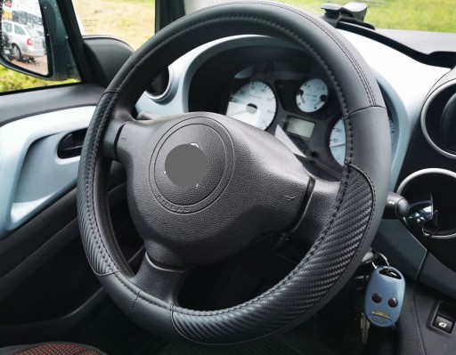 Pokrowiec na kierownicę z wysokiej jakości materiałów (ekoskóra połączona z imitacją karbonu).