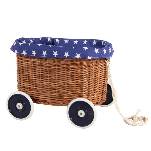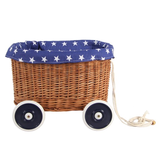 Uroczy wiklinowy wózek na sznurku dla chłopca do wożenia misiów, klocków i innych dziecięcych skarbów z serii Eco Line Mini :) Kosz wyplatany ręcznie. Koła plastikowe z granatowymi elementami. W komplecie znajduje się wkładka uszyta z granatowej bawełny w gwiazdki, którą można dodatkowo wyściełać wnętrze wózka.