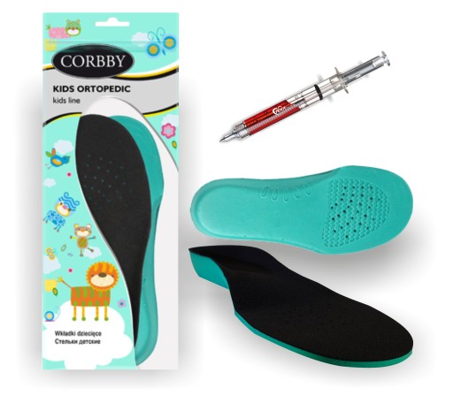 Nowoczesne wkładki zdrowotne dla dzieci Kids Ortopedic są produktem medycznym, najwyższej jakości firmy Corbby. Wkładki profilowane z korytkiem są wykonane z materiału typu Eva, warstwa wierzchnia pokryta materiałem welurowym, bardzo dobrze stabilizują stopy, utrzymując prawidłowe ich położenie w trakcie chodzenia. Wkładki profilują tyłostopie i śródstopie, supinują mocno piętę, zapobiegając opadaniu sklepienia podłużnego stopy. Dzięki budowie korytkowej chronią staw skokowy przed koślawieniem kostek, zapobiegają koślawości pięt oraz koślawości kolan. Służą do prawidłowego ustawienia stóp płasko – koślawych. Amortyzują mikrowstrząsy powstałe podczas chodzenia, pobudzają mięśnie i więzadła do dynamicznej pracy. Polecane do obuwia profilaktycznego, ortopedycznego i standardowego.
