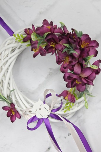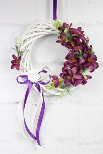 Wianek wiklinowy wybielany o średnicy 25cm, udekorowany przestrzennie kwiatami i pąkami satynowej frezji w odcieniu purpury.