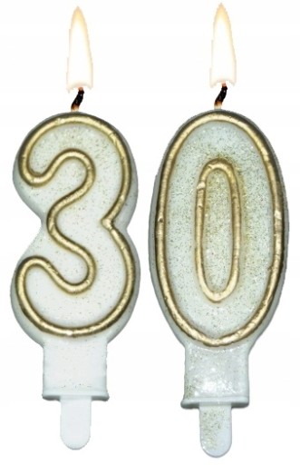 - Świeczka z podstawką i złotą obwódką z cyferkami "3" i "0" (wysokość 7,5 cm, szerokość 4 cm)