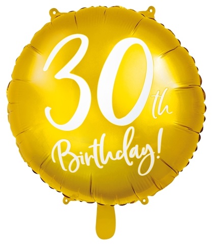 - Balon foliowy metalizowany, okrągły w kolorze złotym z białym napisem "30th Birthday"