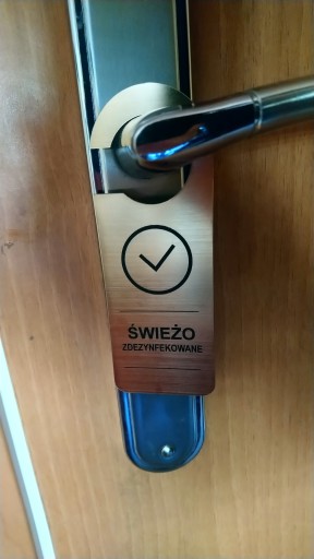 Tabliczka na drzwi z informacją o dezynfekcji do powieszenia na klamkę.