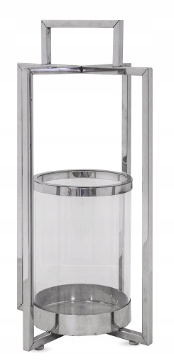 Geometryczny świecznik w połyskującym, srebrnym kolorze, wykonany z metalu.