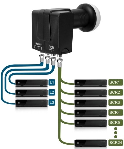 - 1x wyjście SCR dla maksymalnie 24 odbiorników na jednym kablu koncentrycznym (musi być zgodne ze standardem SAT-SCR)