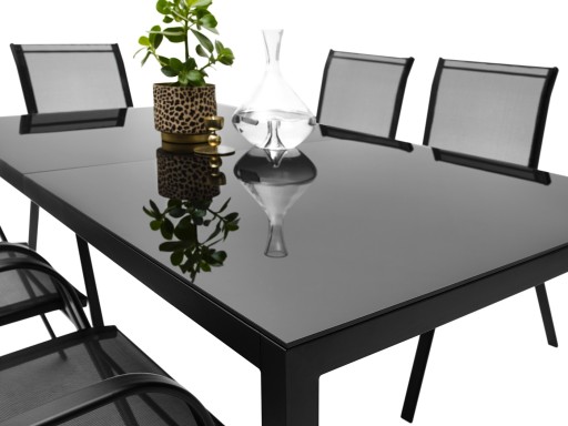 ZESTAW MEBLI OGRODOWYCH idealny do Twojego ogrodu. Stelaż został podwójnie lakierowany proszkowo, co idealnie przystosowuje ten produkt to zastosowania wewnątrz jak i na zewnątrz. Siedzisko krzesła oraz oparcie zostało zrobione z czarnego, elastycznego obicia tekstylnego tak, aby maksymalnie zwiększyć wygodę. Posiada ono dwa oparcia boczne. Użyte materiały nie wymagają częstej konserwacji, są odporne na warunki pogodowe i nie wymagają specjalnych środków do pielęgnacji. Nóżki są dodatkowo zaopatrzone w nakładki z tworzywa sztucznego.Stół posiada blat z czarnej hartowanej szyby o gr. 5 mm.