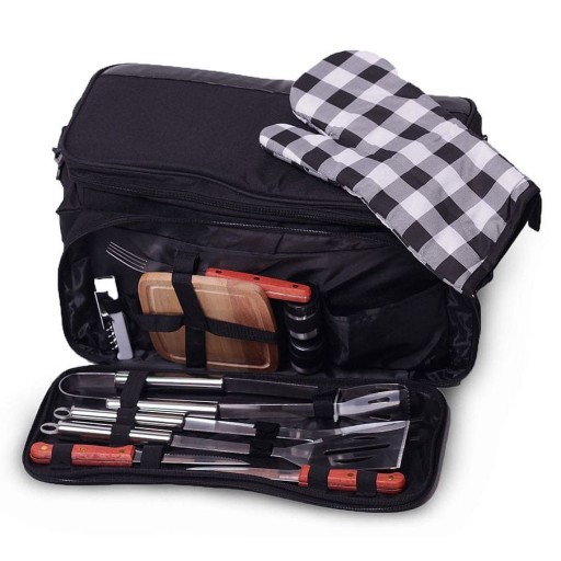 - w skład zestawu do grillowania wchodzą: drewniana deska do krojenia, rękawica ochronna, solniczka, pieprzniczka, scyzoryk z korkociągiem i otwieraczem do konserw, sztućce - widelec, nóż, nóż do steków, sztućce grillowe - szczypce, łopatka, widelec