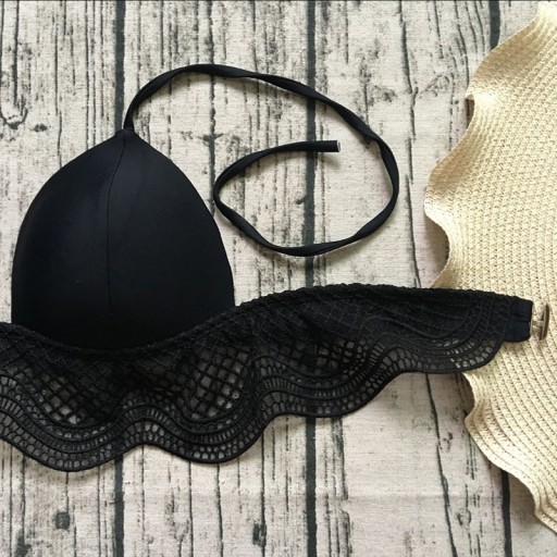 Usztywniany biustonosz wykończony koronkowym paskiem, wycięte i wyprofilowane majteczki optycznie wydłużają nogi, a falbanka optycznie wyszczupli talię.