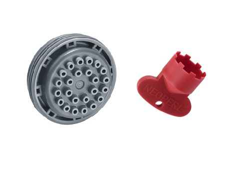 Perlator Neoperl® Slim PCA Spray 1,9 l/min M24x1 z systemem łatwego usuwania osadu SLC w zestawie z kluczem serwisowym.
