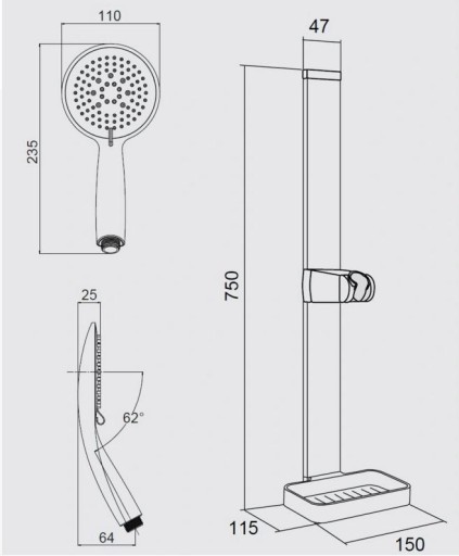 - w skład zestawu wchodzi samoprzylepny drążek z półką (mydelniczką), trzyfunkcyjna słuchawka oraz wąż natryskowy z przyłączem 1/2" pasujący do wszystkich baterii natryskowych oraz wannowych dostępnych na naszym rynku