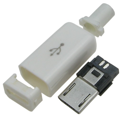 Wtyk micro USB typu B na kabel. Obudowa plastikowa w kolorze białym, wyprowadzone do lutowania wszystkie 5 pinów. Cena za 1 szt