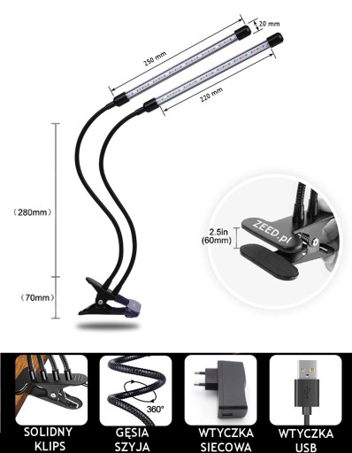 - Lampa wyposażona jest w zasilacz z europejską wtyczką i kabel USB. Możliwe jest podłączenie zasilania sieciowego, lub podpięcie do np. laptopa.
