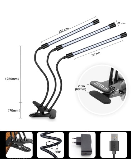 - Lampa wyposażona jest w zasilacz z europejską wtyczką i kabel USB. Możliwe jest podłączenie zasilania sieciowego, lub podpięcie do np. laptopa.
