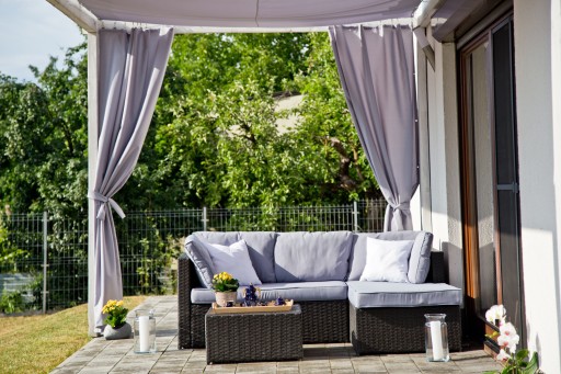 Nasze zasłony wykonane są z splotu powstrzymującego krople wody przed wsiąkaniem - woda spływa po nich, dzięki czemu zasłona doskonale chroni przed lekkim deszczem, pozwalając cieszyć się świeżym powietrzem również w trakcie niepogody.