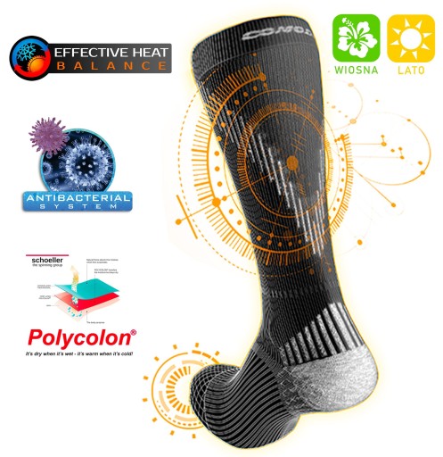 POLYCOLON – to bardzo lekki a zarazem wytrzymały materiał wykonany z najwyższej jakości przędzy polipropylenowej firmy Schoeller Austria. Jego główną zaletą jest doskonałe odprowadzenie wilgoci i potu na zewnątrz, dzięki czemu noga pozostaje zawsze sucha nawet podczas intensywnego wysiłku, co zwiększa poczucie komfortu.