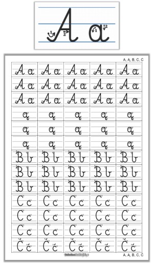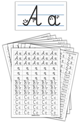 Zestaw wklejek do zeszytu z małymi i dużymi literami pisanymi. Na każdej naklejce dodatkowo zaznaczona strzałkami kolejność kreślenia danej litery.