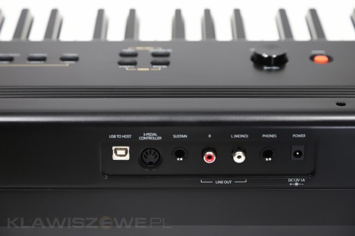 - Wejścia: USB, MIDI Out, pedału Sustain, Line Out L/R, słuchawkowe 1/4", DC