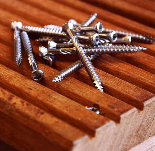- mniejszy nakład pracy - brak konieczności nawiercania wstępnego i poszerzania otworu pod łeb wkręta (choć w przypadku mocowania blisko krawędzi deski zalecane jest wiercenie wstępne ze względu na istniejące ryzyko rozwarstwienia drewna z upływem czasu),