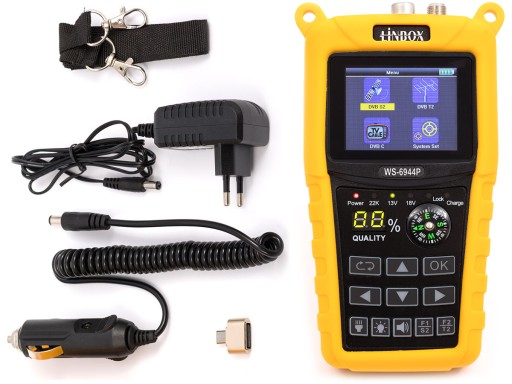 Miernik sygnału satelitarnego, naziemnego i kablowego firmy Linbox model WS-6944 z kolorowym wyświetlaczem LCD. Dzięki bardzo czułej głowicy satelitarnej pozwalający łatwo i precyzyjnie ustawić antenę satelitarną na właściwego satelitę. Miernik przygotowany jest do wyszukiwania poziomu sygnału na wszystkich satelitach z terenu Europy (HOTBIRD, ASTRA I INNE) i posiada wpisane kilkanaście pozycji satelitarnych (satelity + transpondery). Wbudowany edytor umożliwia edycję każdego parametru satelity i transponderów. Model WS-6944 posiada pomiar kanałów DVB-S2 - HD. W komplecie firmowy zasilacz oraz ładowarka samochodowa, menu miernika w języku polskim co sprawia go prostym w użyciu. Głowica naziemna mierzy poziom, jakość sygnału oraz MER.
