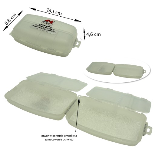 Bardzo wytrzymały 2-komorowy przybornik wykonany jest z tworzywa, które nie wchodzi w reakcję z twisterami, jego konstrukcja oraz dobór materiału sprawiają, że przybornik zawsze utrzymuje się na wodzie. Oś zawiasu jest wykonana z mosiądzu, co zapobiega korozji. Otwór w korpusie umożliwia zamocowanie uchwytu. Dno obustronnie wyłożone białą pianką.