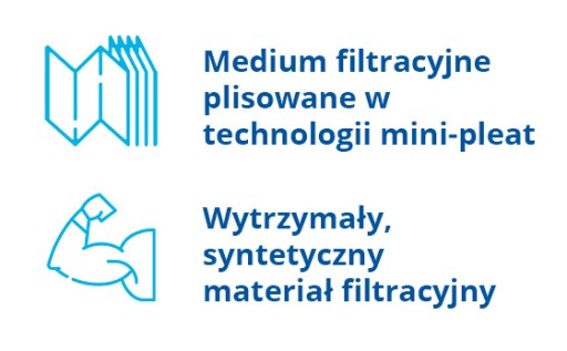 Dzięki wykorzystaniu technologii mini-pleat filtry charakteryzują się wydłużoną trwałościa oraz zwiększonej o 60% pojemnością pyłową w porównaniu z prostymi filtrami typu coarse (G4).