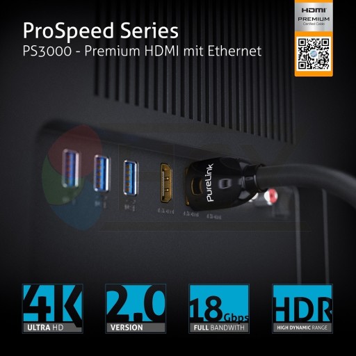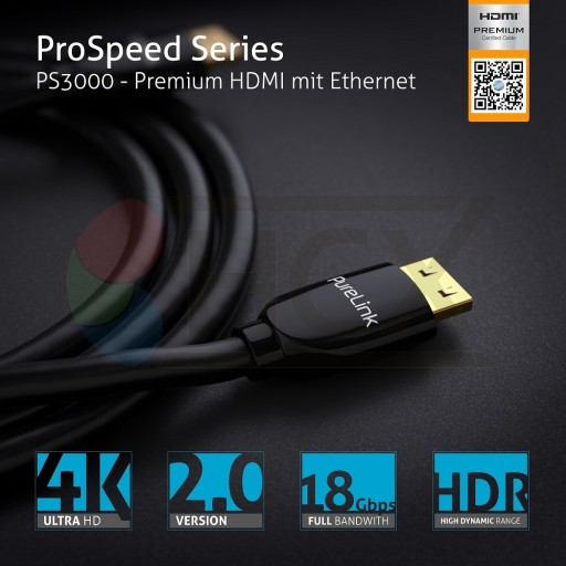 Seria Purelink ProSpeed PS3000 obsługuje pełną pasmo 18Gb / s przy długości do 5 metrów dla rozdzielczości do 4K @ 60Hz przy pełnym spektrum kolorów i kontrastu. Bezstratna transmisja zgodna ze standardem HDMI 2.0b jest możliwa dzięki trzykrotnemu ekranowaniu, złoconym stykom i zastosowaniu wysokiej jakości miedzi OFC jako wewnętrznych przewodników. Wtyk, środkowa skorupa oraz tylna część w której kabel łączy się z całą wtyczką wykonane są z jednego kawałka metalu i są praktycznie niezniszczalne. Cechą charakterystyczną jest mały promień skrętu co razem z wysoką przepustowością i wysoką jakością sprawia, że kable doskonale sprawdzają się do instalacji profesjonalnych i domowych. Ekranowana, w pełni metalowa obudowa z 24-karatowym złotem złączami zapewnia najlepszą dostępną jakość transmisji sygnału.