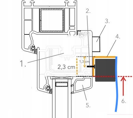 1 - rama okna | 2- wkręt mocujący | 3 -wywietrznik | 4. uchwyt | 5 - listwa przyszybowa | 6. mierzysz do tego miejsca wg instrukcji.