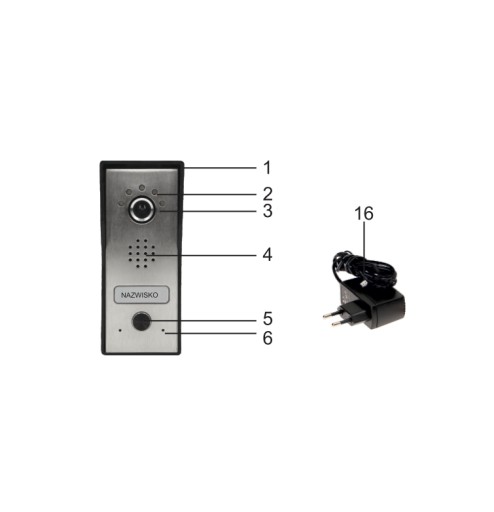 - Panel zewnętrzny z kamerą CMOS, montaż natynkowy, daszek ochronny w zestawie, miejsce na nazwisko, oświetlenie jasnymi diodami LED umożliwia widzenie w nocy.