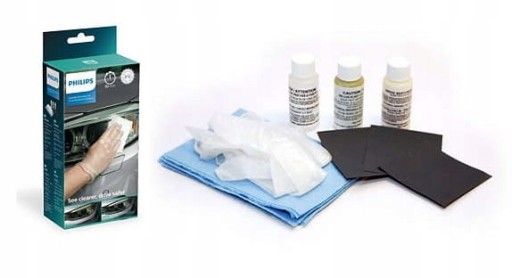 Zestaw do renowacji reflektorów firmy Philips pozwala usunąć smugi i przebarwienia, dzięki czemu reflektory mogą znów wyglądać jak nowe.