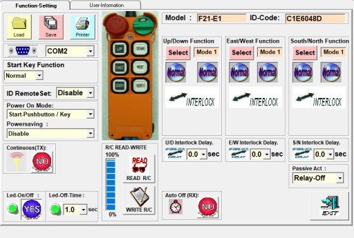 Pilot wykonany z niezwykle twardego kompozytu Fiberglass odpornego na uszkodzenia. Gumowane uszczelnienia przycisków zapewniają ochronę IP65 a przyciski produkcji ALPS zapewnią wieloletnią pracę bez awarii. Przyciski mogą być programowane jako monostabilne / bistabilne poprzez zewnętrzny kabel serwisowy. Pilot wyposażony w 6 przycisków kierunkowych , zatrzaskowy / obrotowy przycisk bezpieczeństwa Emergency oraz dwu funkcyjny przycisk załączania obwodu sterowania START + dodatkowy obwód Ro (np. sygnalizator akustyczny, oświetlenie itp)