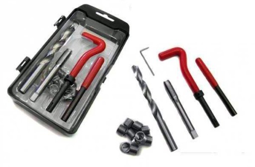 Zawartość zestawu: • 1szt. wiertło - do wywiercenia uszkodzonego gwintu • 1szt. gwintownik - do wytoczenia nowego gwintu o odpowiedniej średnicy i kroju • 1szt. przyrząd do instalacji wkładki - umożliwia łatwe i precyzyjne włożenie wkładki gwintowej do otworu • 1szt. trzpień do usuwania zabieraka wkładki - ułatwia usuwanie zabieraka z wkładki po włożeniu jej do otworu • 10szt. wkładek gwintowych - zapewniają trwałą i niezawodną naprawę gwintu.