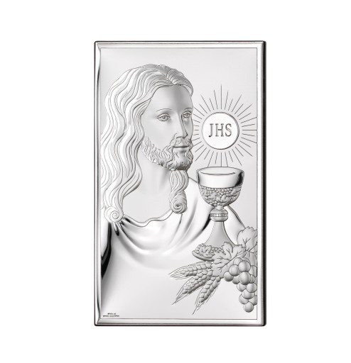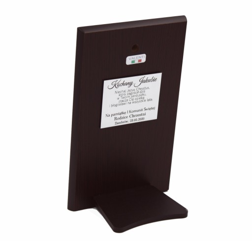 Pamiątka włoskiej firmy VALENTI z wizerunkiem Jezusa wraz z emblematem kielicha, hostii. Obrazek zdobi brązowe drewno. Dzięki wkładanej podpórce możemy pamiątkę ustawić na szafce lub komodzie.