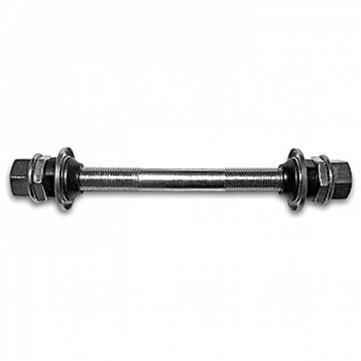 Oś Chromo-Molibdenowa na śruby do piasty przedniej. długość całkowita ośki 140mm. Szerokość 3/8" (około 9,4mm). Gwint 3/8" / 26tpi. Oś można zastosować do różnych piast przednich. W zestawie z osią znajdują się konusy, nakrętki i dystanse.