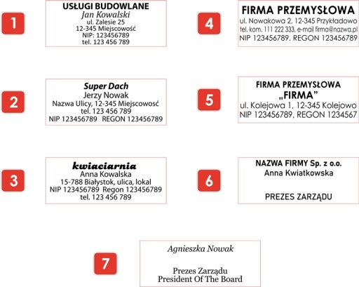 Nie masz pomysłu jak powinna wyglądać Twoja pieczątka? Wybierz układ, który najbardziej Ci odpowiada z poniższych wzorów podając numer ułożenia treści.