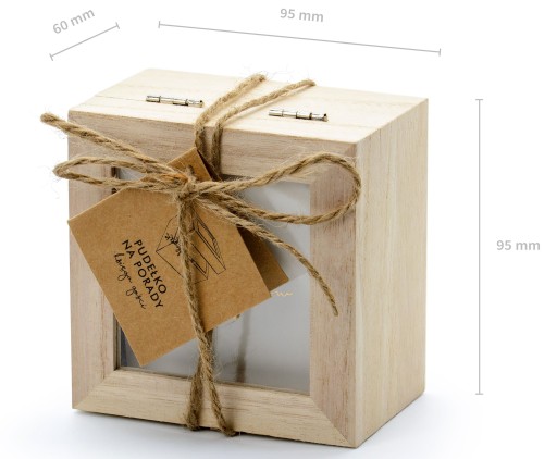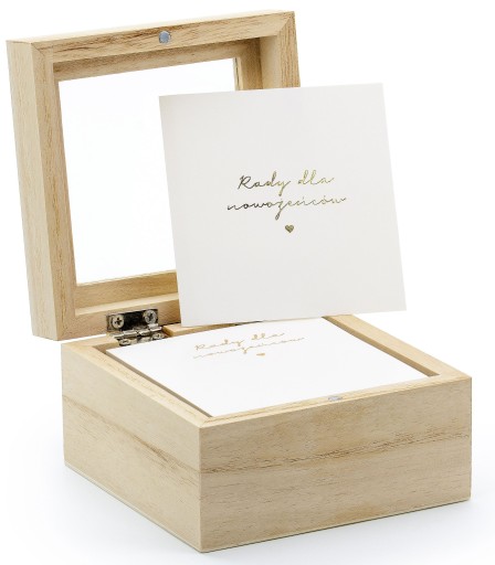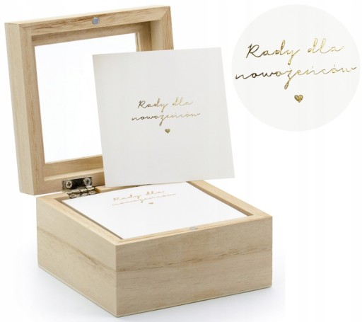 Księga gości - pudełko na porady, zestaw zawiera drewniane pudełko zamykane szklanym wieczkiem oraz białe karteczki ze złotym napisem do wypisania. Produkt w polskiej wersji językowej. Idealne na weselną uroczystość, super zabawa dla gości weselnych. Pudełeczko jest niezwykle eleganckie, minimalistyczne oraz wykonane z dużą precyzją. Jego romantyczny i delikatny motyw będzie pasował do dekoracji weselnych w każdej kolorystyce.