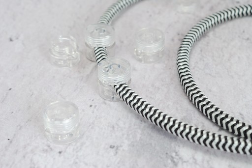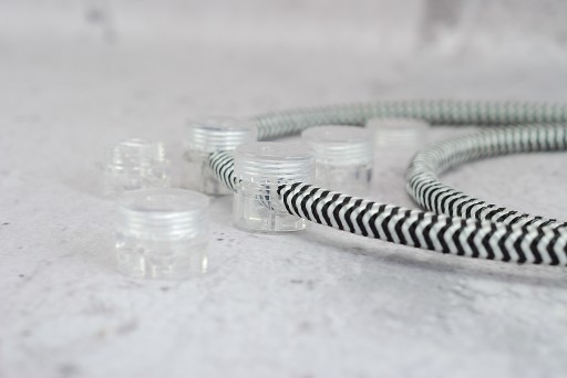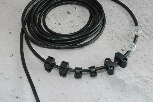 Uchwyty montuje się bardzo prosto, składają się z dwóch elementów: korpusu, który przykręcamy do ściany, sufitu lub gdziekolwiek oraz nakładki dociskającej. Przykręcamy korpus za pomocą kołka znajdującego się w zestawie, kładziemy przewód i skręcamy nakładkę.