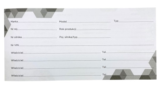miejsce na podstawowe dane samochodu, nazwisko właściciela i nr telefonu.