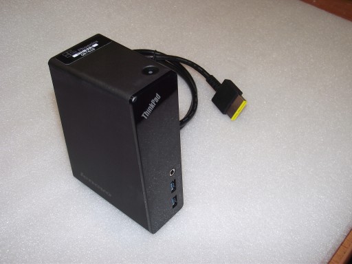 - Gniazdo blokady kabla służące do zapewniania fizycznego bezpieczeństwa znajdujące się z boku stacji dokującej ThinkPad OneLink