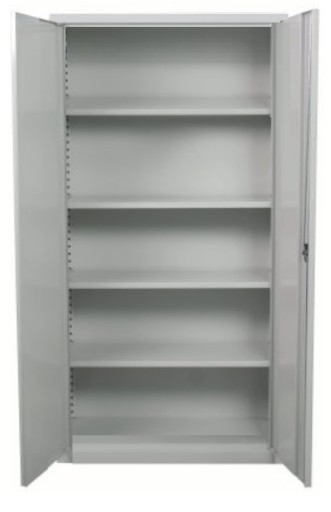 Drzwi skrzydłowe ze schowanymi zawiasami. Uchwyt drzwiowy z zamkiem zabezpieczającym - zamykanie kluczowe. Szafa posiada cztery półki przestawne co 25 mm.