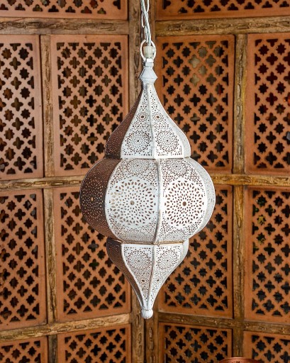 - Kształt jest orientalny indyjski, perforacja jest marokańsko-arabska, idealnie nadaje się jako dekoracja do kreatywnych pomysłów dekoracyjnych, do romantycznego oświetlenia w sypialni, jako lampa stołowa w jadalni, jako lampa wisząca w kuchni lub łazience, lampa wisząca w biurze, lampka nocna w przedpokoju lub korytarzu lub jako prezent.