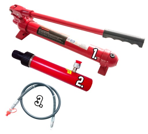 - w zestawie: pompa (1), siłownik (2), wąż hydrauliczny (3) oraz rączka do pompy
