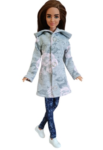 Przedmiotem sprzedaży jest ubranko dla lalki modowej, modelki. Płaszczyk z kapturem uszyty z szarej dzianiny w róże. Zapięcie na profesjonalne springi. Wzór rozmieszczony losowo.