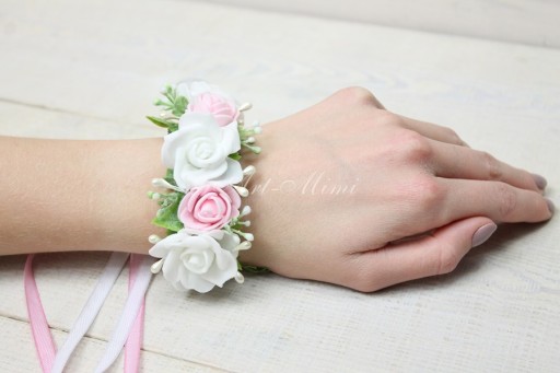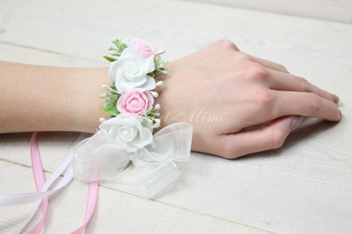 Stroik na rękę posiada odczepianą szyfonową kokardkę z perełką na szpilce.