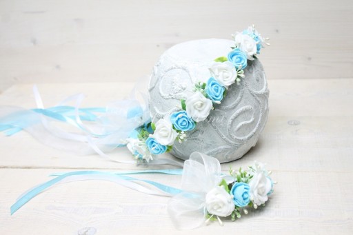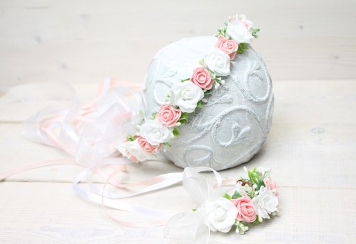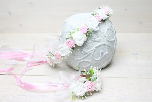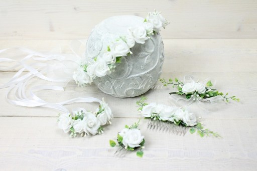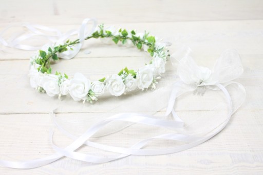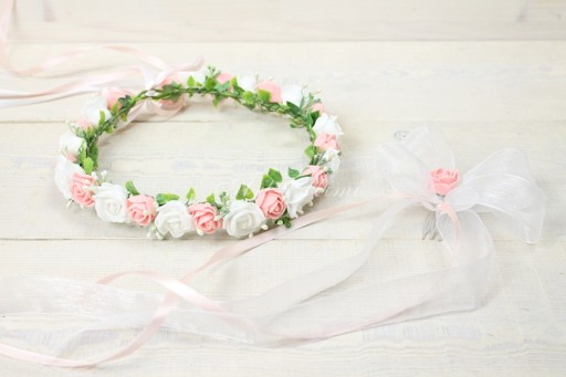 Dodatkowo tył wianuszka posiada odczepianą szyfonową kokardkę z różyczka zamocowaną na grzebyku.