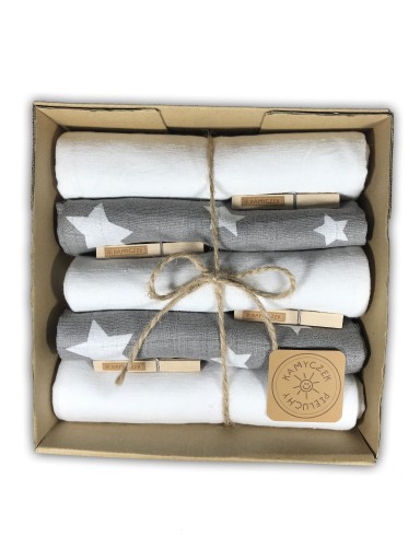 Komplet 5 sztuk najwyższej jakości pieluszek jest efektownie opakowany, gotowy do wręczenia jako prezent. W zestawie znajduje się również gratis w postaci firmowych klamerek.