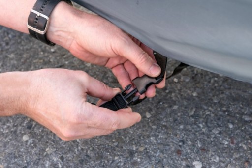 - Skuteczne mocowanie - plandeka dobrze przylega do pojazdu, nawet podczas silnych podmuchów wiatru. Mocowany za pomocą ściągacza przy przednim i tylnym kole oraz taśmy z plastikową klamrą w środkowej części pokrowca